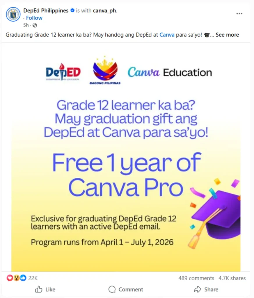 The Department of Education (DepEd), in partnership with Canva Philippines, is offering a free one-year Canva Pro subscription to eligible graduating Grade 12 students for School Year 2025–2026.
