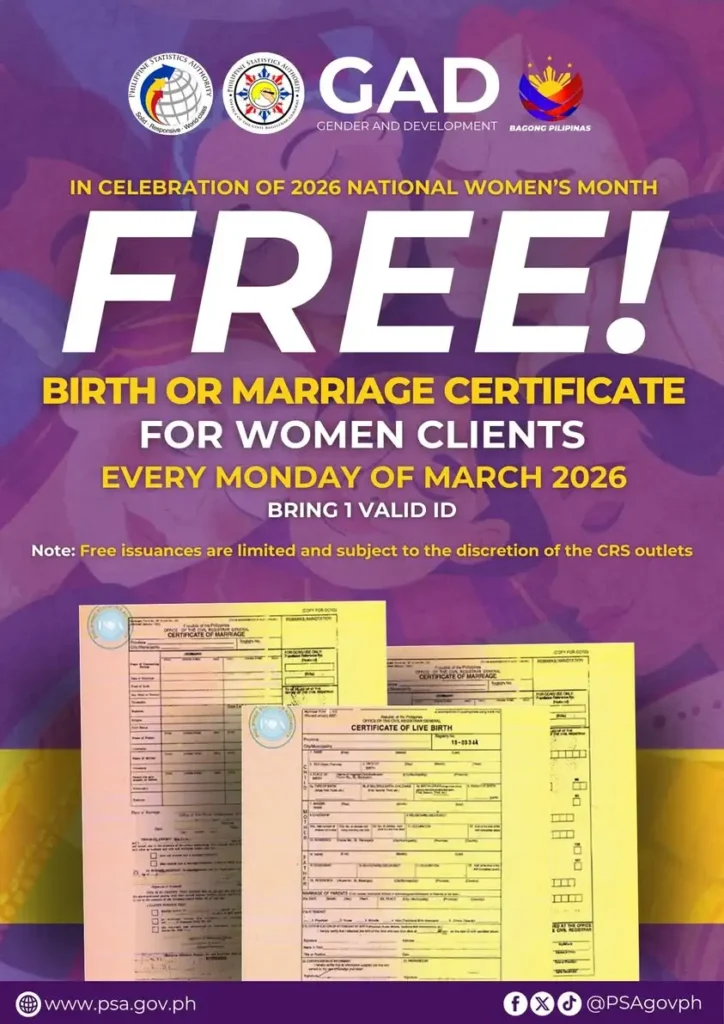 The Philippine Statistics Authority (PSA) announced that women can get a free copy of their birth certificate or marriage certificate every Monday of March.